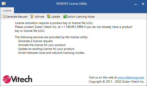 GENESYS users can now use the included GENESYS License Utility to automatically update GENESYS software licenses. Instead of going through the previous process of generating the license c2v file and waiting to receive the corresponding v2c which must then be loaded into the GENESYS License Manager, users can now simply launch the GENESYS License Utility, click the Update button, and the utility will query the Vitech license servers, automatically applying licensing changes. Use of this utility requires an outbound internet connection from machine running the GENESYS License Utility and an existing entitlement on the Vitech servers.