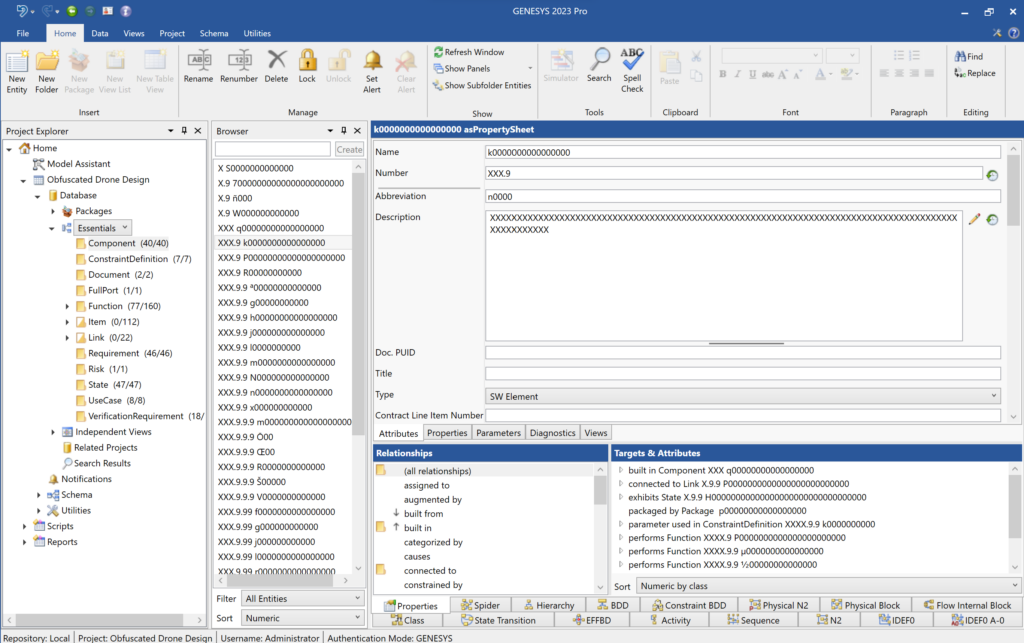 During the process of obfuscation, the model’s size and shape are kept as closely as possible to the original, while attribute values including, but not limited to, strings, enumerations, and collections are replaced with random alphanumeric characters. This is not an encryption process that can be decrypted. It is a one-time transformation that redacts data through a random data replacement process. Obfuscated copies of projects can be imported into GENESYS for viewing and analysis. The screens below show a source model before obfuscation and then the results of the process after importing the obfuscated copy of the model.