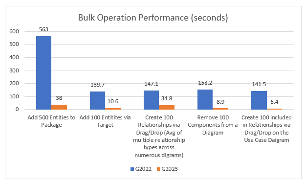 A key initiative for each GENESYS release is to find areas for improving performance, especially when working in teams or on large models. In GENESYS 2023, attention was given to improving the performance of bulk operations. The graphs below illustrate the magnitude of the improvements when performing certain operations with GENESYS 2023 over GENESYS 2022.