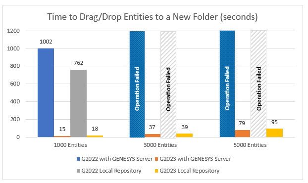 *For the chart above, GENESYS 2022 failed to complete the move operations with 3000 and 5000 entities. Note that these operations run better in GENESYS 2023 with GENESYS Server than using the local repository. Additionally, performance scales in a nearly linear manner.