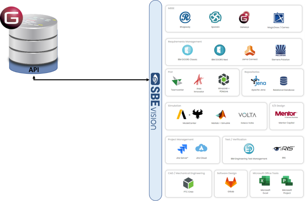 Via SBE Vision, GENESYS can be integrated with PLM, requirements management, simulation, project management, mechanical CAD and other products that connect to SBE Vision, as shown in the diagram below.