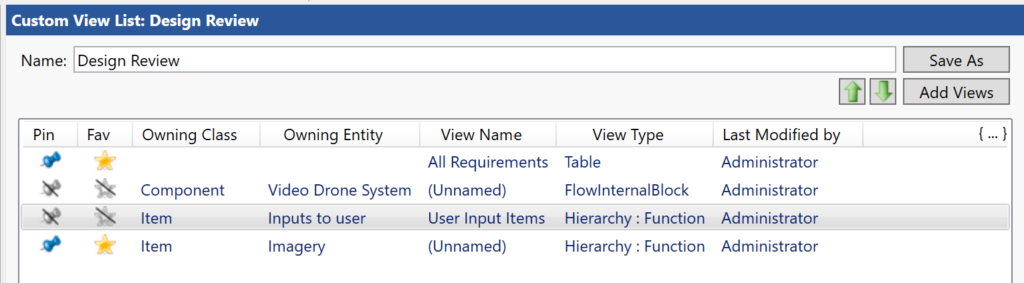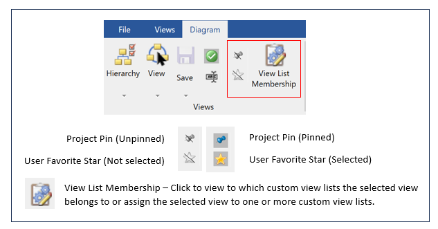 User favorite views – supplies a list of saved views that have been flagged by the user as a favorite. This list is distinctly separate from Project Pinned Views. This allows the individual user to flag and then easily find the diagrams s/he is working on currently or finds most useful in their daily work.